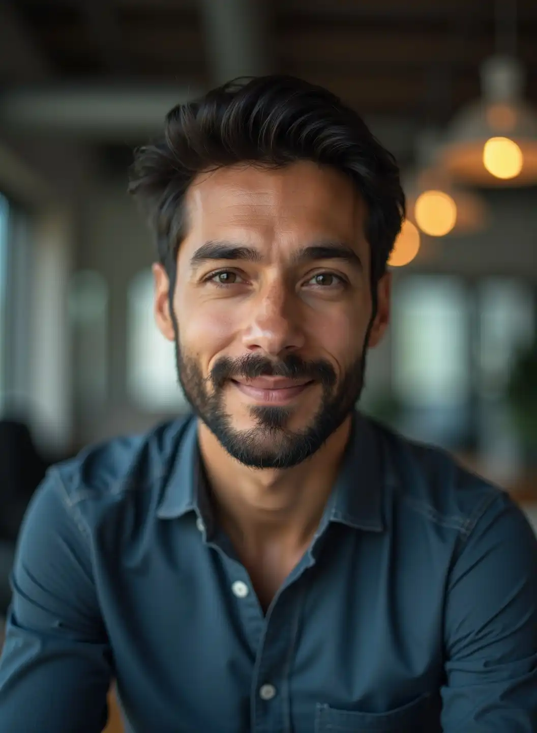 Prompt: Cinematic photo, Generate a wide, realistic image of a professional male looking directly into the camera, as if in a Zoom video meeting. The person should be centered, maintaining natural eye contact, with a confident and approachable expression. Use soft, balanced lighting and a blurred modern office or home-office background.