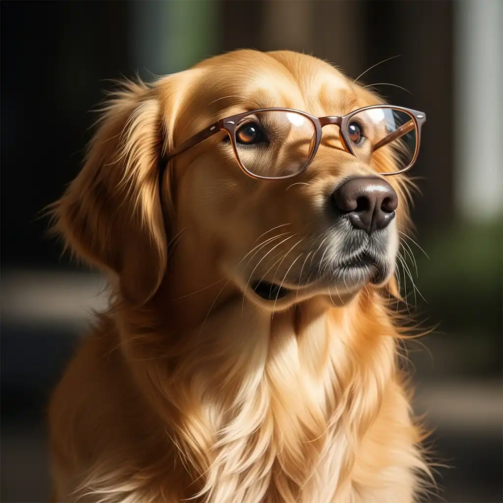 Prompt: Give me an image of golden retriever wearing a pair of brown glasses